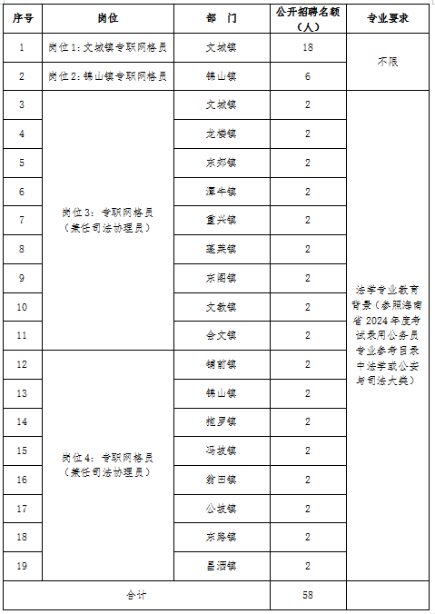 为加强文昌市专职网格员队伍建设,充实配强基层工作力量,提升服务管理效能,根据《文昌市基层网格化服务管理工作实施方案》《文昌市网格化服务管理试点工作实施方案》《文昌市司法协理员制度试点工作实施方案》等文件精神,决定面向社会公开招聘58名专职网格员。现将有关事项公告如下: