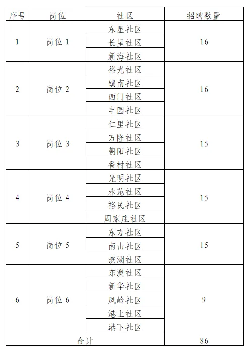 本次共招聘社区专职工作者86名,岗位和招聘数量如下: