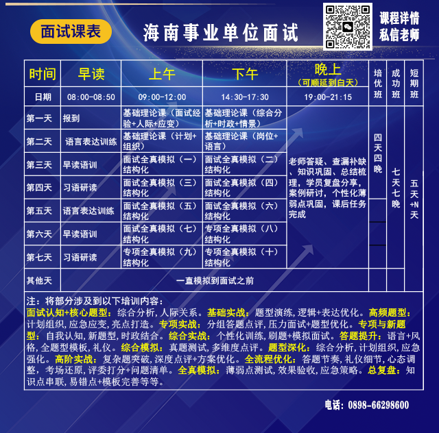 时政热点与情景面试:分析海南历年真题与时政热点,让学员把握时政动态,提升答题的时效性与针对性,增强学员在不同场景下的应变能力。