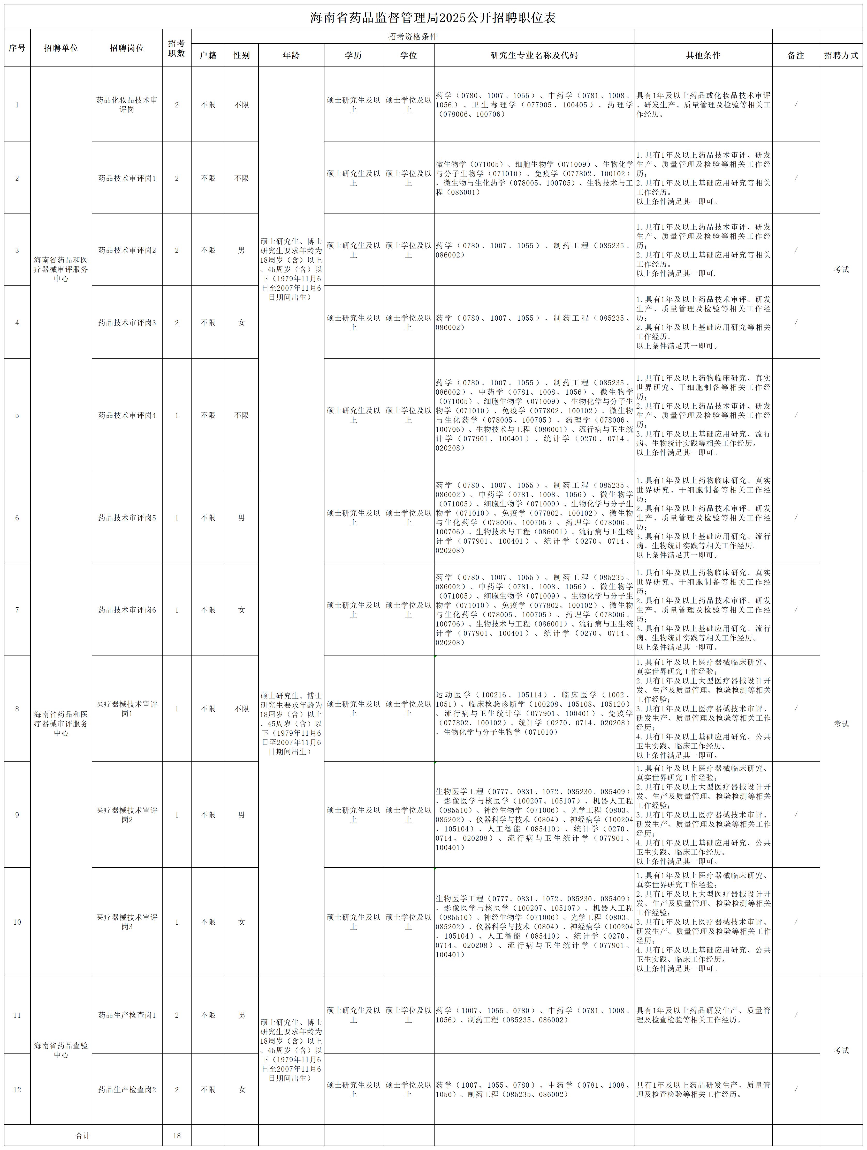 本次公开招聘工作人员共18名,其中,海南省药品和医疗器械审评服务中心招聘专业技术人员14名,海南省药品查验中心招聘专业技术人员4名,具体详见《海南省药品监督管理局直属单位2025年公开招聘工作人员职位表》(附件1)。
